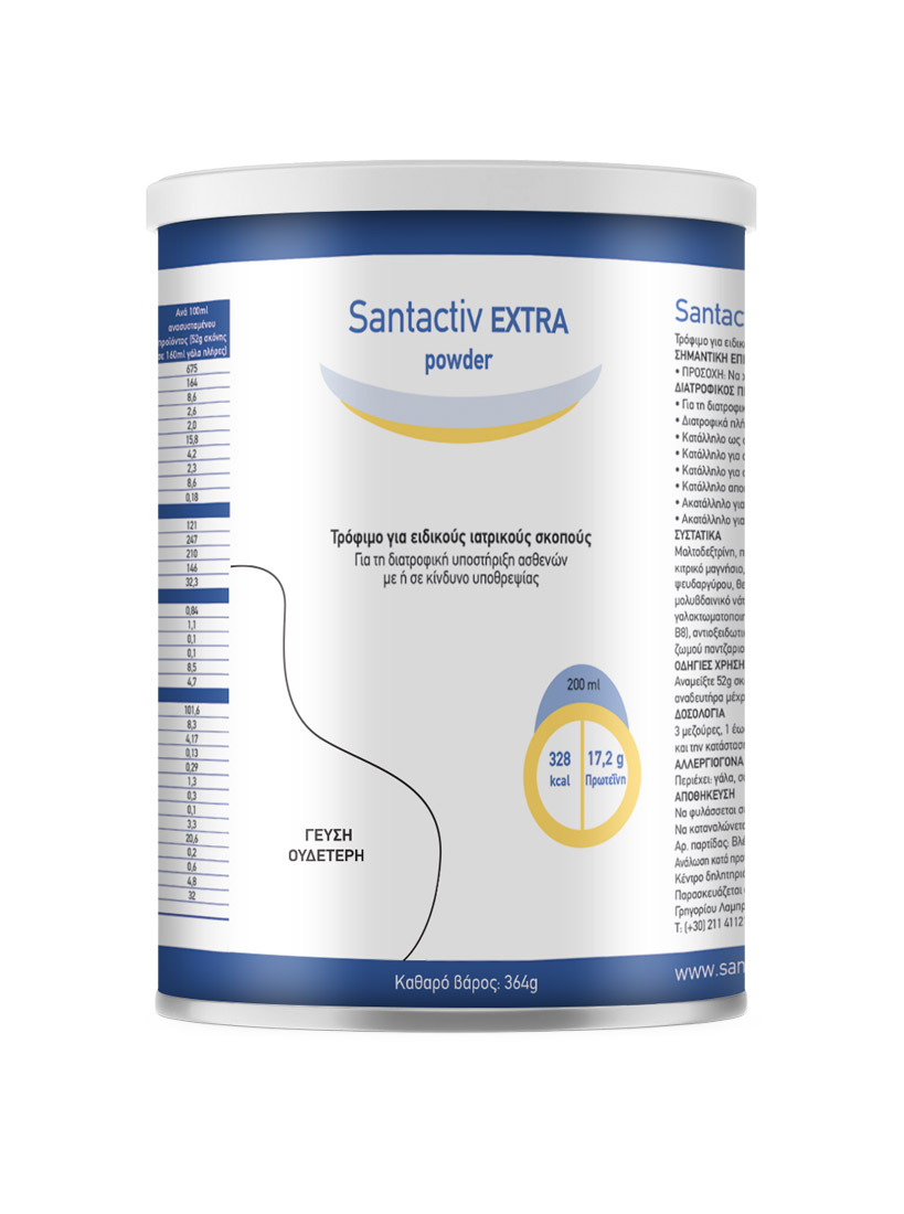 Το SANTACTIV EXTRA NEUTRAL είναι tρόφιμο για Ειδικούς Ιατρικούς Σκοπούς. Διατροφικά πλήρες σκεύασμα σε μορφή σκόνης, υψηλής περιεκτικότητας σε πρωτεΐνη, για τη διατροφική υποστήριξη ασθενών με ή σε κίνδυνο υποθρεψίας.